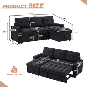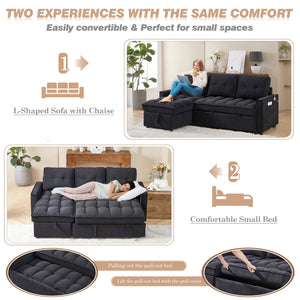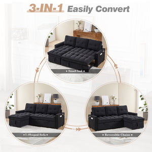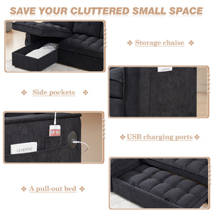 Dinosisco Convertible Sofa Bed with Reversible Storage Chaise, Sleeper Sectional Sofa with USB Charging Ports, L-Shaped Sectional Sofa for Apartment, Black Chenille