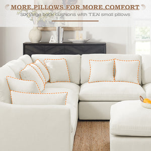 The seat is padded with foam and down feather, complemented by pocket spring for comfort that feels like you're on a cloud. The corner sofa features 6 large back cushions and extra 10 pillows for comfort and support. Whether you're curled up with a game or hosting a movie night, this L-shaped sectional sofa for living room is your sanctuary for relaxation.