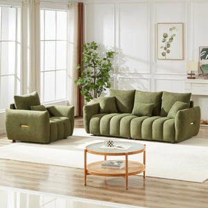 This chair and sofa set from the Pure Collection is a perfect blend of minimalist modern style and detailed, sleek design. Wide striped seating with pillow-shaped arms are accented with a striking metallic sheen. Such a novel and unique look will bring fresh appeal to any space. The soft teddy fabric with high rebound foam padding allows you to indulge in great comfort. Also with high quality frame materials and excellent craftsmanship, this 2 pieces living room sofa set is built to last. It's the perfect combination of style and comfort, and also the perfect choice for you and your family.