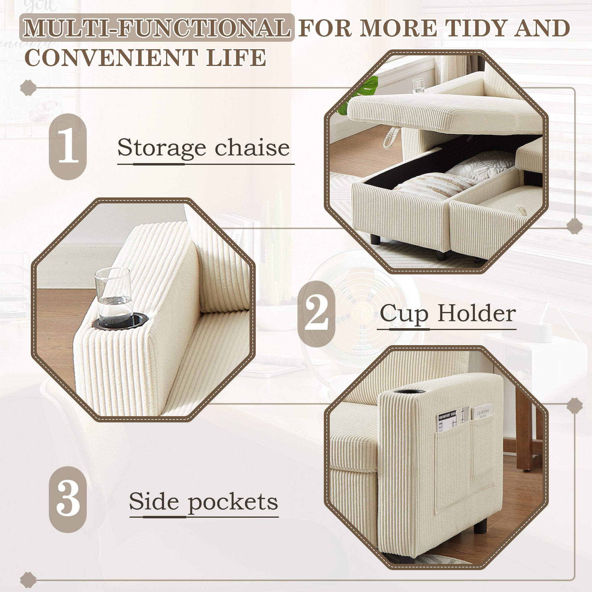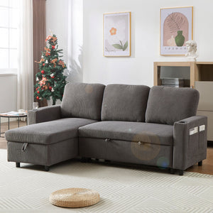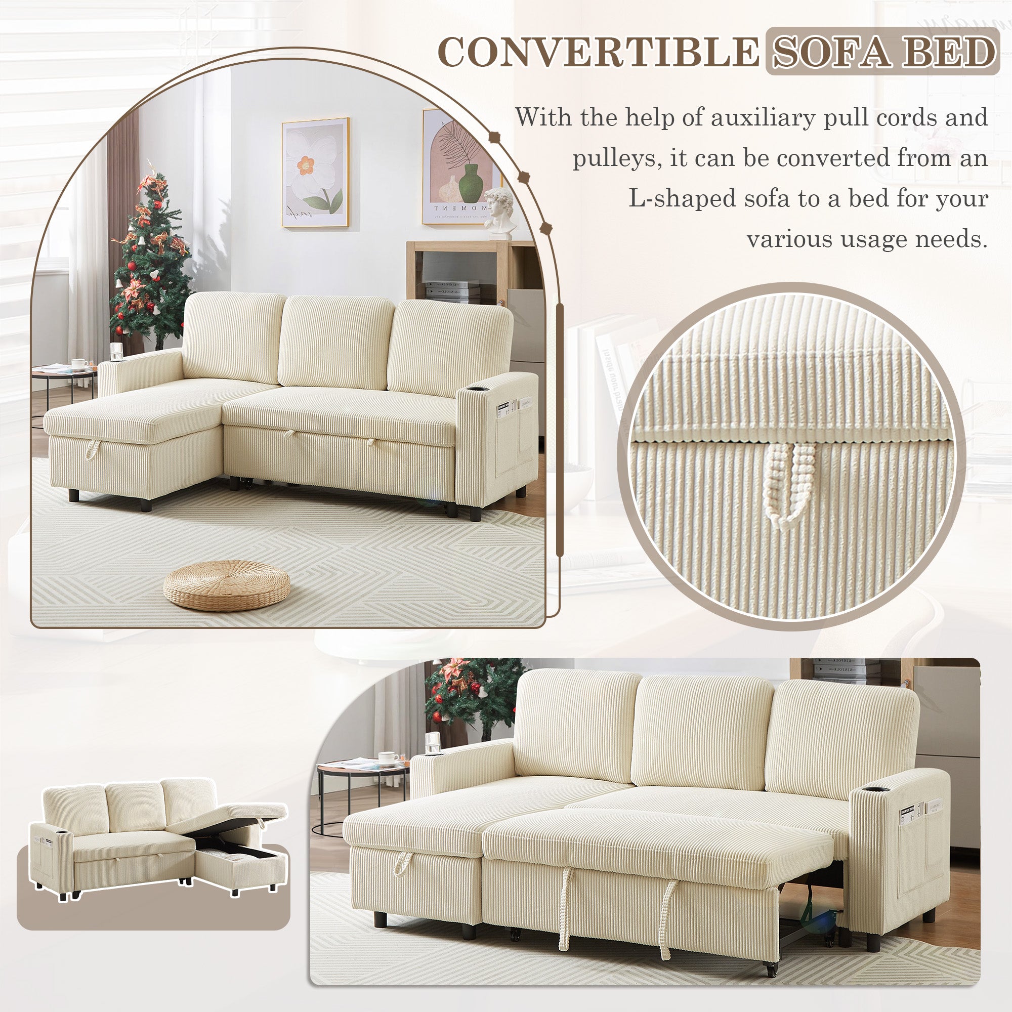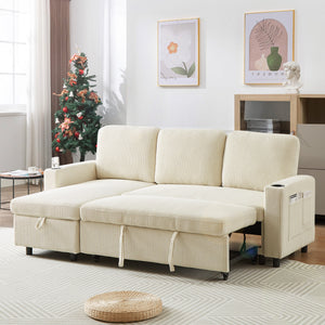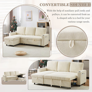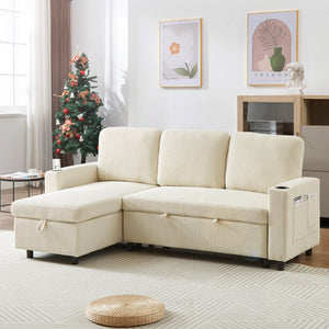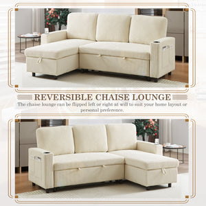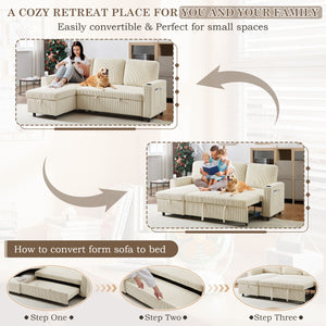 Dinosisco Sleeper Sofa Sectional, Convertible Sofa Bed with Reversible Storage Chaise, Cup Holders, Corduroy L-Shaped Sectional Sofa for Apartment, Living Room, Beige