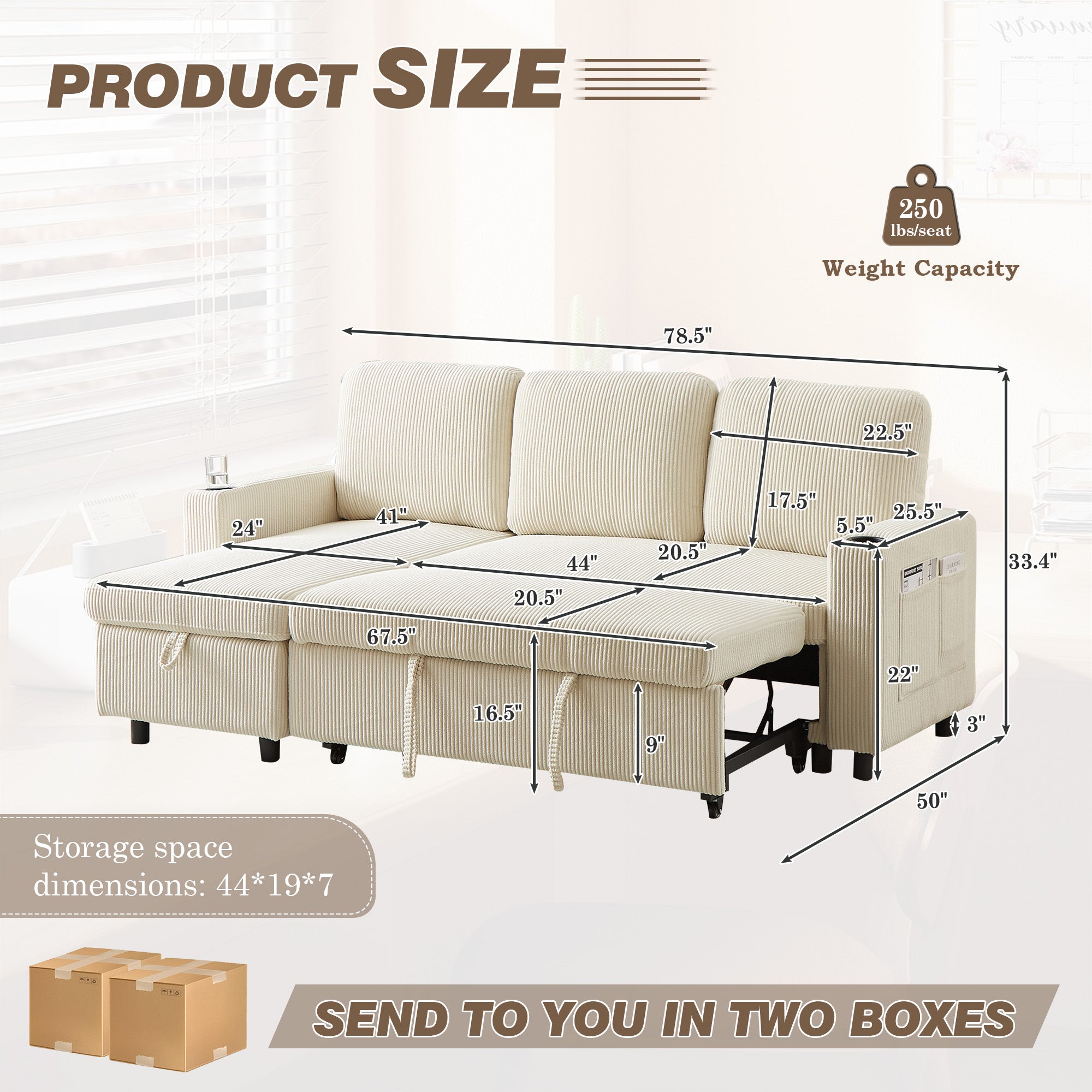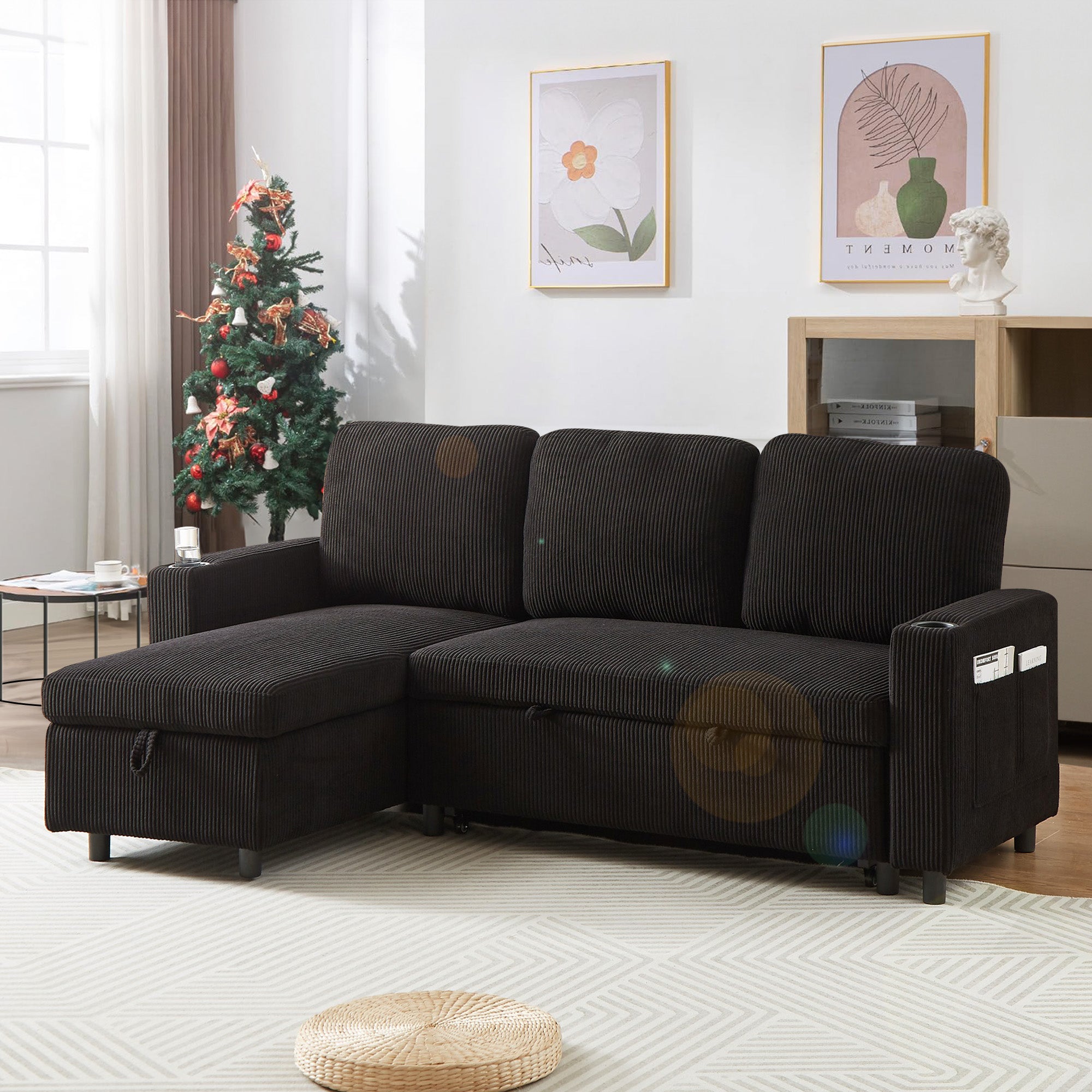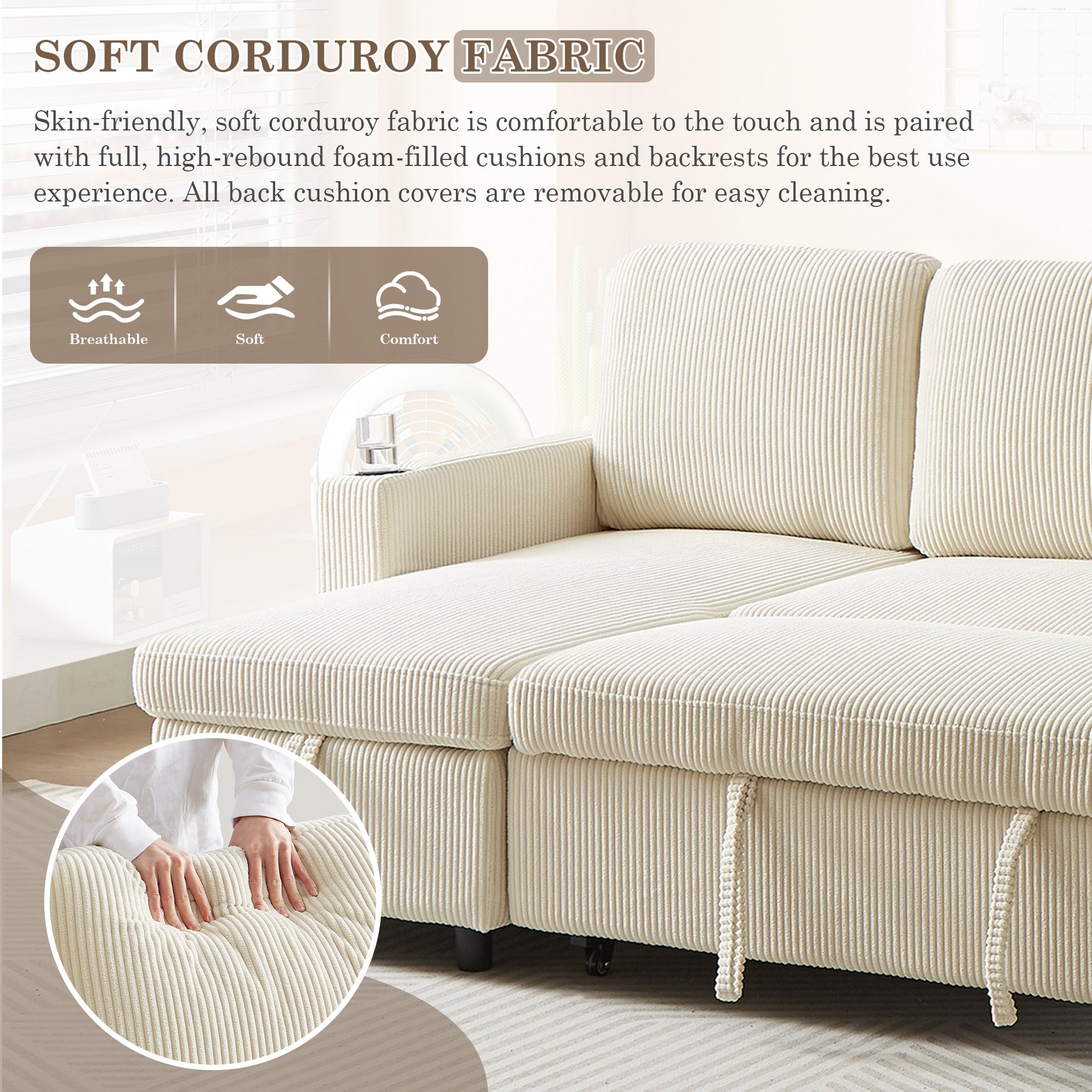 Dinosisco Sleeper Sofa Sectional, Convertible Sofa Bed with Reversible Storage Chaise, Cup Holders, Corduroy L-Shaped Sectional Sofa for Apartment, Living Room, Beige