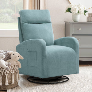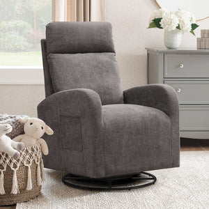 The sturdy metal base of this rocking chair ensures 360 degrees of free and smooth rotation with a gentle 40-degree rocking motion, immersing you in relaxation and tranquility. The swivel glider chair is wrapped in a soft teddy fabric that adds a cozy touch while providing you with a comfortable seating experience. The high back with built-in head and lumbar pillows provides plenty of comfort and support. Whenever you sit in our swivel glider rocker, its softness and comfort provide a healing experience of relaxation. Feel free to lean back and soak in the gentle rocking, resting peacefully with your baby in a serene and peaceful atmosphere.